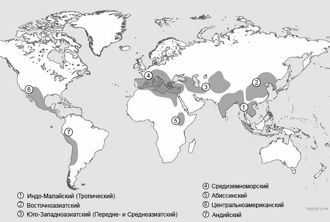 Юго-Западноазиатский: пшеница, бобовые, виноград, тыквенные.